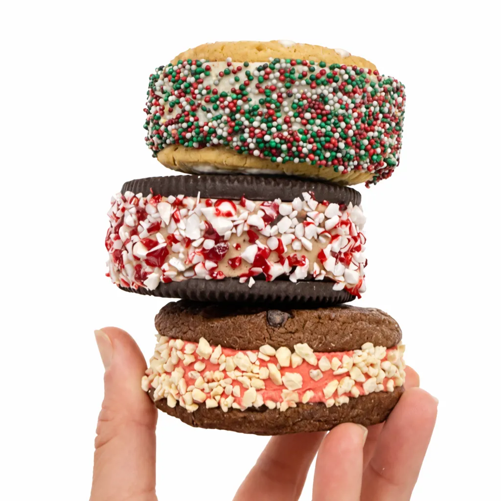 Custom ice cream sandwiches made with your choice of cookie, your choice of ice cream, and rolled in your favorite topping!